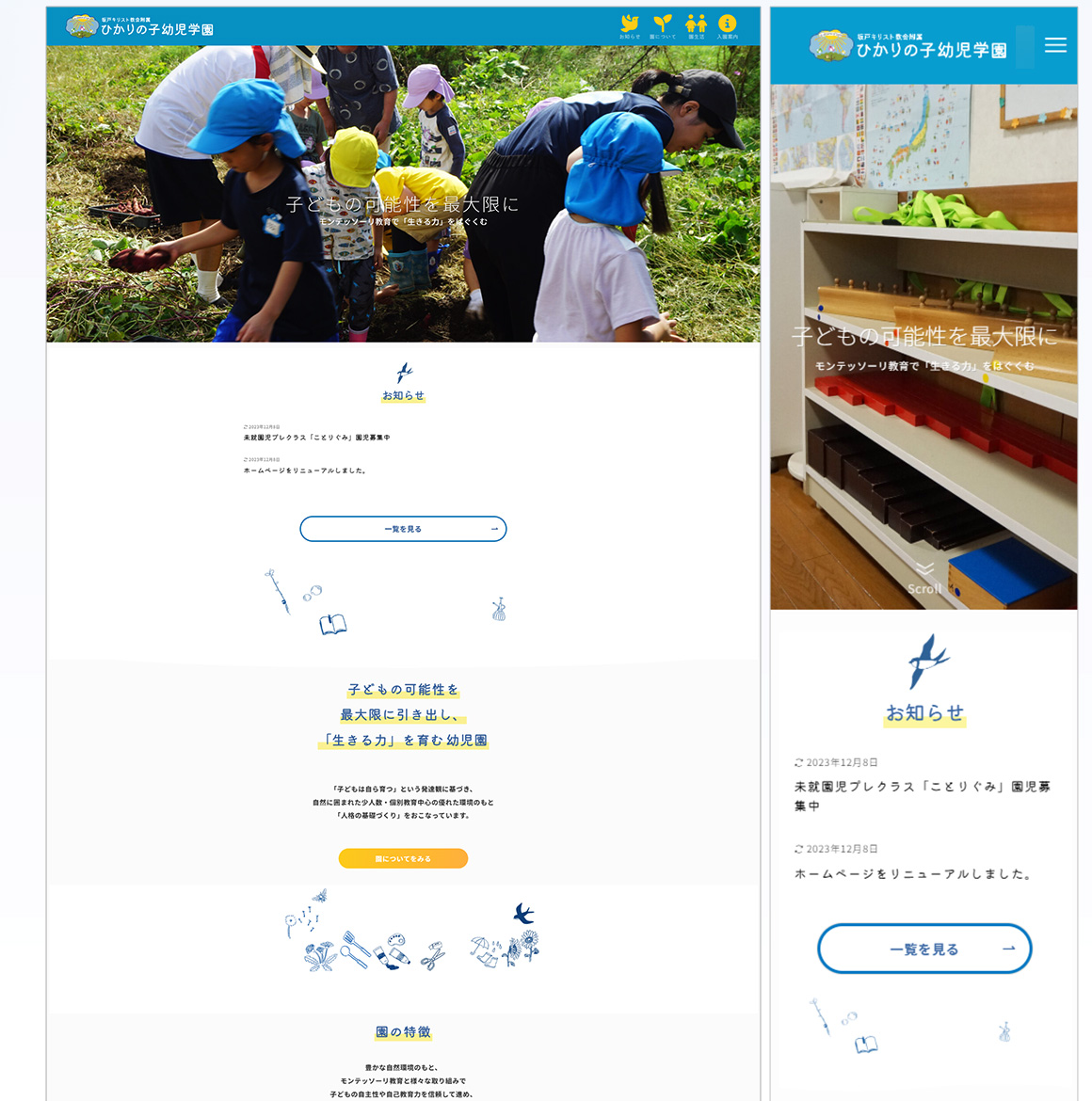 既存サイトはなく、園の情報を正確に伝える場が不足。目的は「園の理念を伝えるデザイン」と「入園案内導線の整備」でした。制作アプローチ